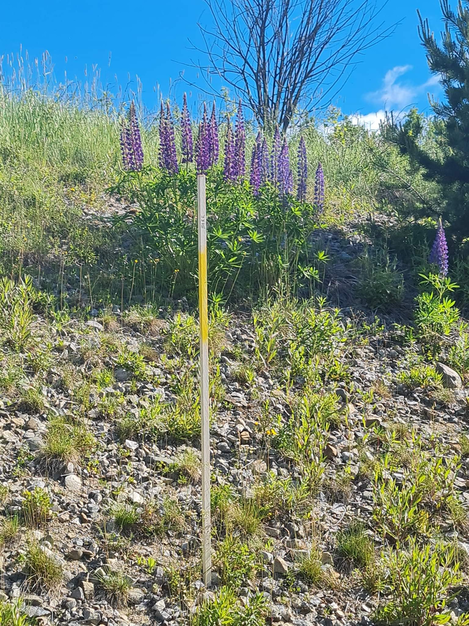 Grävsäsongen är nära, och inför den förbereds det för fullt i projektområdena! Bland annat märks det ut en hel del längs med de planerade grävstråken. Det handlar om markeringar i form av tex pinnar och sprayningar på mark som anvisar tex brunnsplaceringar eller var redan befintliga ledningar (el, kabeltv, vatten, avlopp osv) går. Då det handlar om olika ledningsägare som markerar ledningar markeras det också med olika färg på käppar och sprayning. Stadsnätets spray vid anvisninga av befintligt stråk är alltid gul/gulgrön.